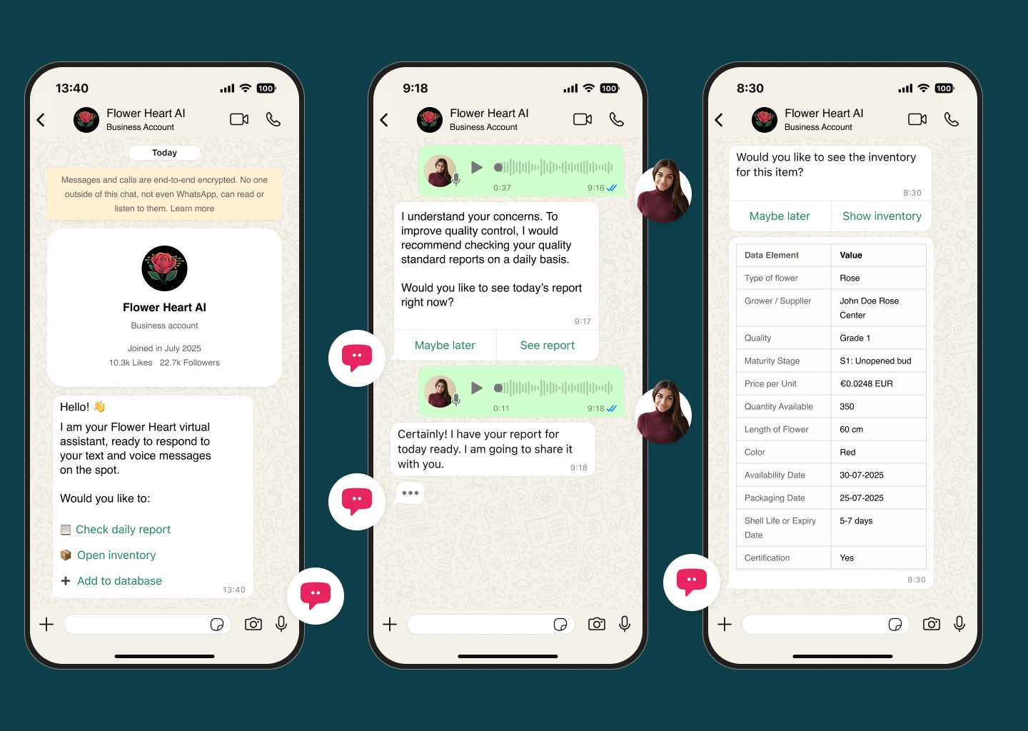 FlowerHeartAI helpt bloemenbedrijven sneller en met minder fouten te werken. We hebben het platform gebouwd rond de dagelijkse operationele stroom: kwaliteitscontroles, voorraadbeheer, inkoop, rapportage en teamcommunicatie. Het resultaat is een AI-assistent die werkt via bekende tools zoals WhatsApp en voice, en tegelijkertijd verbinding maakt met bestaande systemen zoals Florisoft, Floriday, Excel en planningssoftware.
